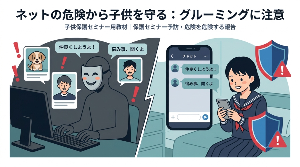 サインとしては、「急に優しくなる」「二人だけの秘密を共有させようとする」「親や周囲の大人から引き離そうとする(あいつらは分かってない、俺だけが味方だ等)」といった言動に注意が必要です。 子どもが不自然に特定の「ネット上の友達」に執着している場合は、慎重に見守る必要があります。